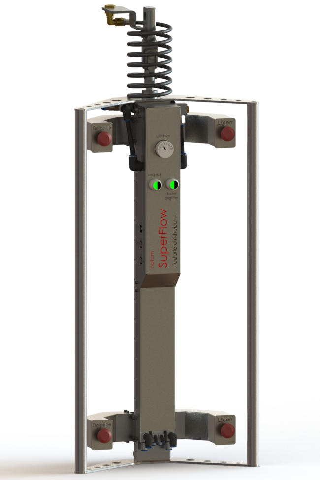Der SuperFlow Pneumatikbalancer ist ein Handhabungsgerät zum Heben, Halten und Bewegen von Lasten.Je nach Baugröße des integrierten Hubzylinders bietet der SuperFlow bis zu 350 kg Traglast. Durch die integrierte Pneumatiksteuerung wird die Last in einen Schwebezustand versetzt und kann mit geringstem Kraftaufwand feinfühlig im Raum bewegt und positioniert werden.Der Bediener führt die schwebende Last am Bedienungshandlauf und kontrolliert selbst die Position und die Geschwindigkeit der Last und das ohne Betätigung von Bedienelementen und mit geringstem Kraftaufwand.Der Pneumatikbalancer SuperFlow besteht aus einem kompakten und gewichtsoptimierten Grundgerät. Aufgrund des geringen Eigengewichts und der Leichtlaufeigenschaften bietet er eine sehr hohe Ergonomie und Bedienerfreundlichkeit.Durch die redundanten (Bedientasten oben und unten) und höhenverstellbaren Bedienelemente ermöglicht das Gerät eine ergonomische Lastführung in aufrechter und rückenschonender Körperhaltung.Der Bedienungshandlauf erstreckt sich über die gesamte Hubhöhe.Das Grundgerät besteht aus einem pneumatischen Hubzylinder mit integrierter Schwebesteuerung, dem Bedienungshandlauf mit redundanten und höhenverstellbaren Bedienelementen, einem Adapter zur Anbindung an einen Schienenlaufwagen, sowie einem unterseitigen Befestigungsflansch mit pneumatischer Schnittstelle zum Anbringen beliebiger Lastaufnahmemittel.(Pneumatikgreifer, Vakuumsauggreifer, Magnetgreifer, Lasthaken, Lastgabel)Der SuperFlow Pneumatikbalancer kann einfach und schnell in jedes beliebige Schienensystem integriert werden.